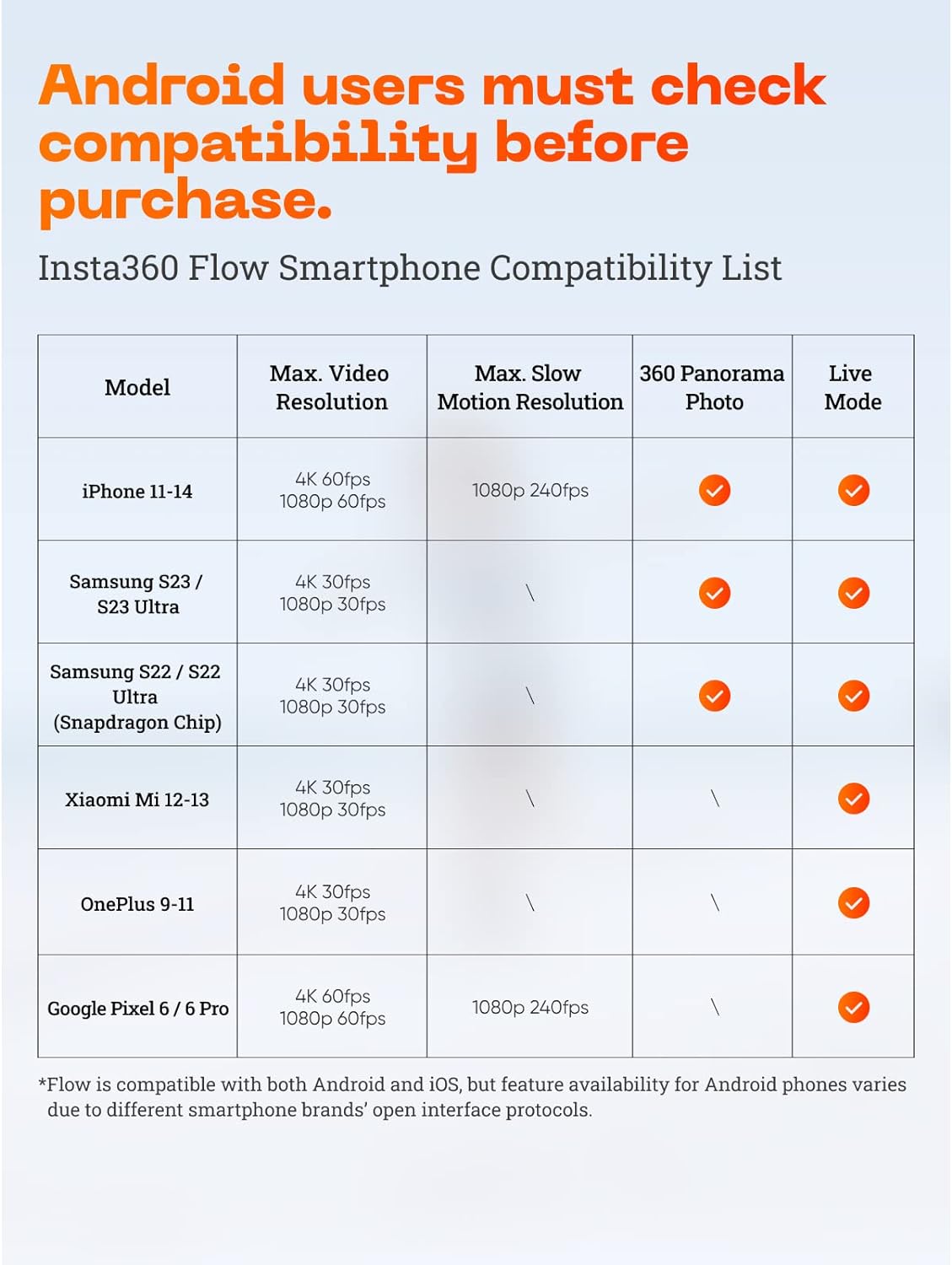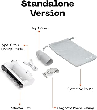 Included Components: Insta360 Flow Gimbal, Protective Pouch, Magnetic Phone Clamp, Grip Cover, Type-C to A Charge Cable