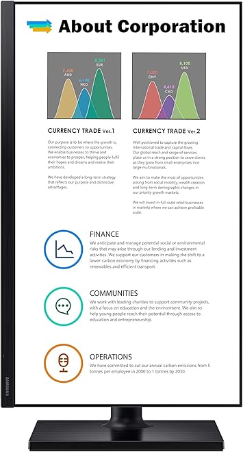 The Samsung FT45 Series is a professional-grade 24-inch monitor designed for productivity and comfort. Its Full HD IPS panel delivers crisp visuals and wide viewing angles, while the 75Hz refresh rate ensures smooth performance. With a fully adjustable stand, multiple connectivity options, and a built-in USB hub, this monitor is made to adapt to your workspace needs. Eye Saver Mode and Flicker-Free technology keep you comfortable during long hours of work or study.